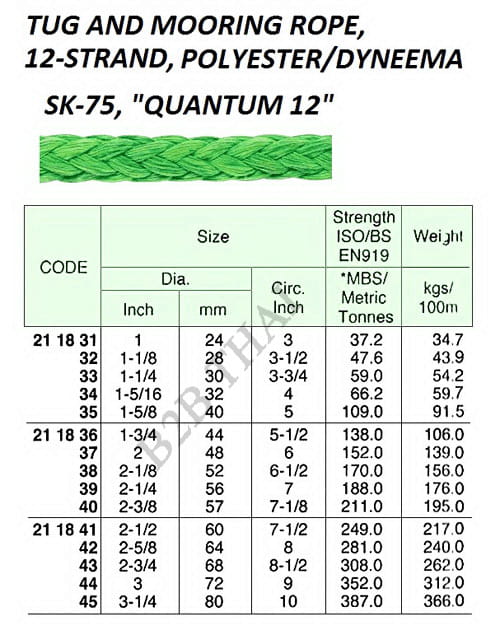 IMPA211841 TUG AND MOORING ROPE, 12-STRAND, POLYESTER/DYNEEMA SK-75, QUANTUM 12, 200 MTR x 60 MM, BTL: 249 TON