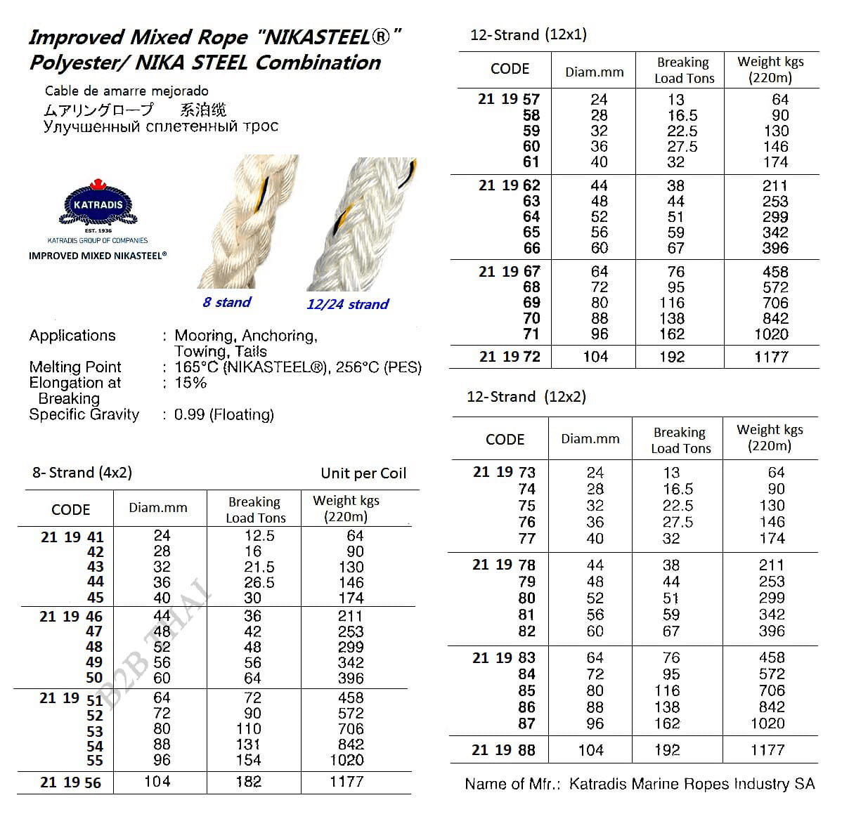 IMPA211952 MOORING ROPE, IMPROVED MIX ROPE, POLYESTER COMBINATION, NIKASTEEL, 8-STRAND (4X2), 72 MM, BTL: 90 TON