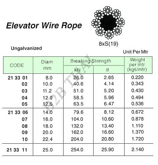 WIRE ROPE FOR ELEVATOR, UN-GAL. 8xS(19) FC, 14.0 MM