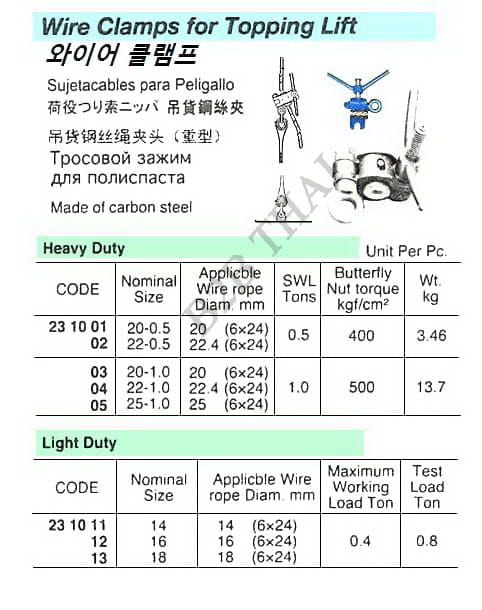 LIGHT DUTY WIRE CLAMP FOR TOPPING LIFT, 16 MM ROPE SWL 0.4 TON