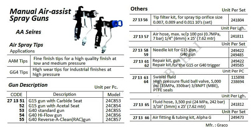 IMPA271358 MANUAL AIR-ASSIST SPRAY NEEDLE KIT FOR G15 GUN, 249422, GRACO