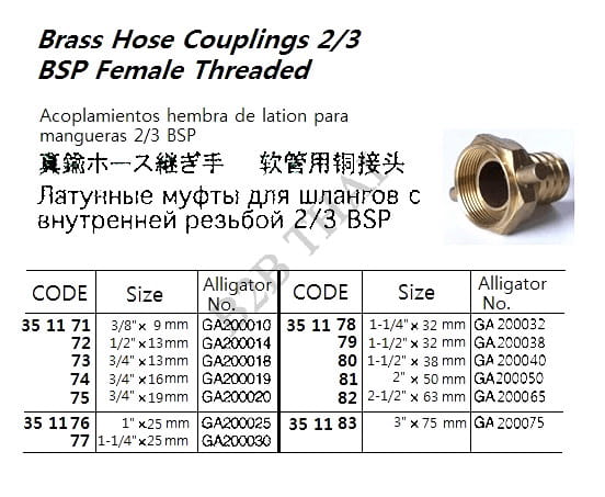 BRASS HOSE COUPLING 2/3 BSP FEMALE THREAD, 3″x 75 MM, GA200075, ALLIGATOR