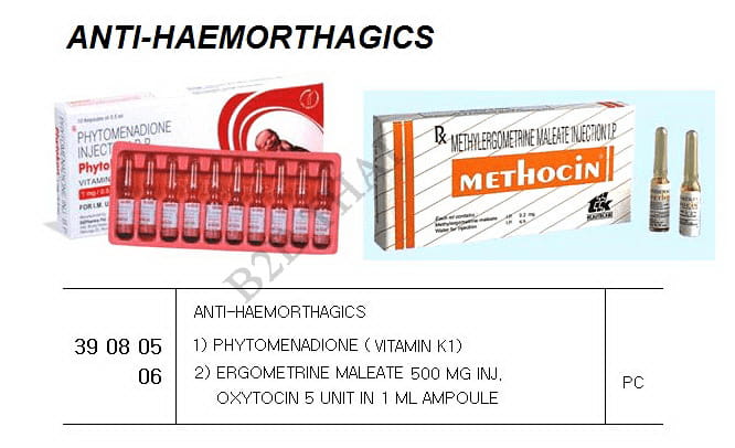 ANTI-HAEMORTHAGICS 2) ERGOMETRINE MALEATE 500 MG INJ. OXYTOCIN 5 UNIT IN 1 ML AMPOULE