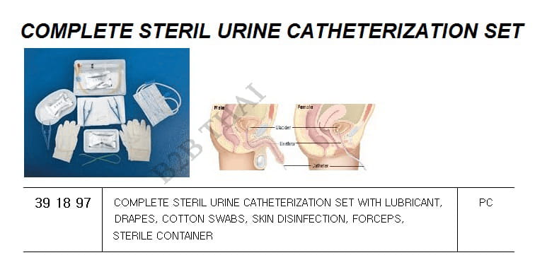 COMPLETE STERIL URINE CATHETERIZATION SET WITH LUBRICANT, DRAPES, COTTON SWABS, SKIN DISINFECTION, FORCEPS, STERILE CONTAINER