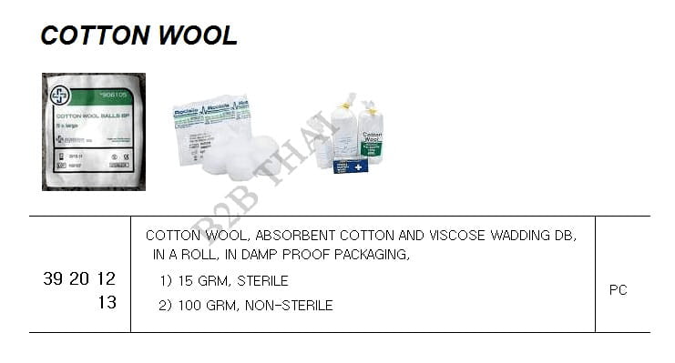 COTTON WOOL, ABSORBENT COTTON AND VISCOSE WADDING DB, IN A ROLL, IN DAMP PROOF PACKAGING, 2) 100 GRM, NON-STERILE