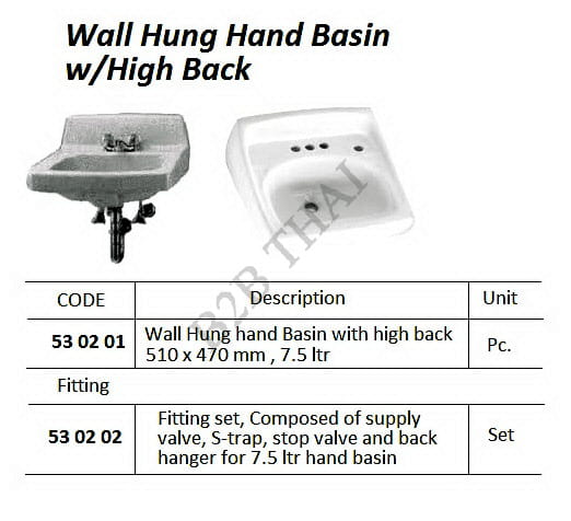 IMPA530202 FITTINGS FOR WALL HUNG HAND BASIN 510 x 470 MM 7.5 LTR