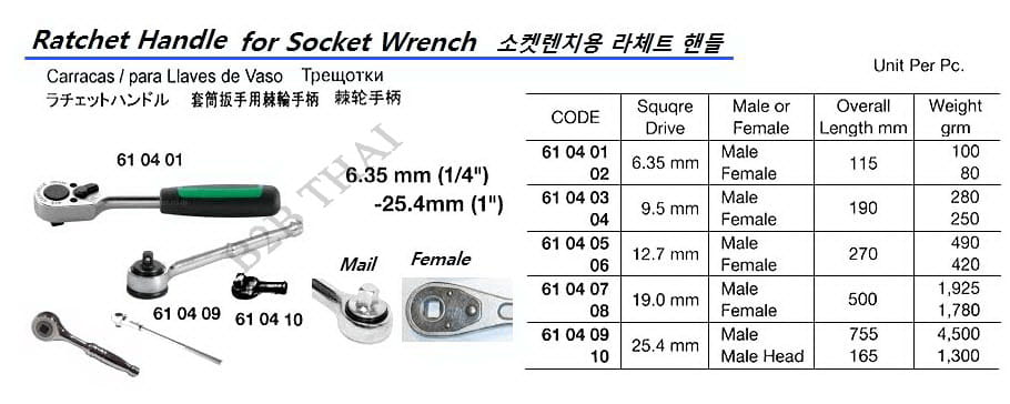IMPA610403 RATCHET HANDLE MALE 9.5MM/SQ DRIVE 190 MM