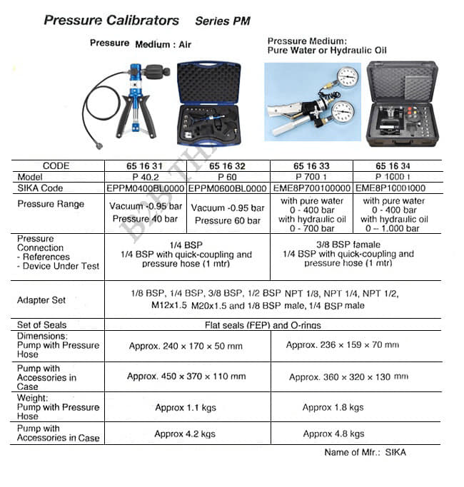 IMPA651634 PRESSURE CALIBRATOR BY PURE WATER OR HYD. OIL, P 1000.1, SIKA