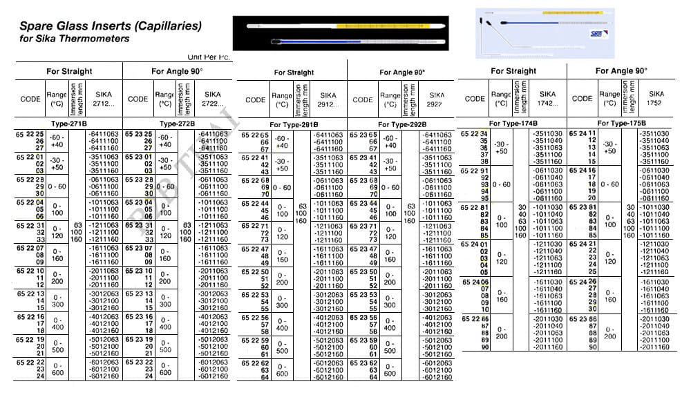 SPARE INSERT THERMOMETER GLASS, FOR 90o ANGLE SIKA 292B, 0~400 oC, 160 MM