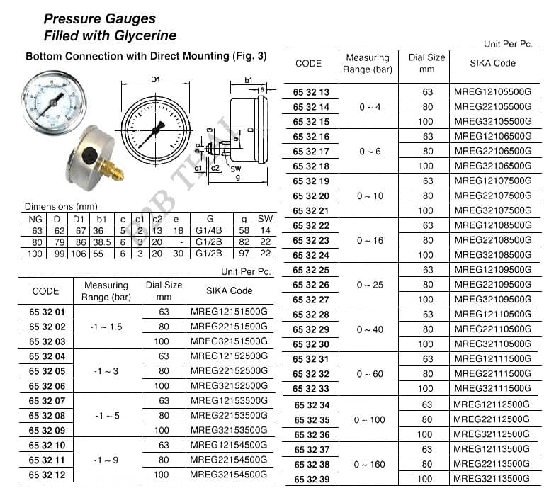 PRESSURE GAUVE, FILLED WITH GLYCERINE, BOTTOM BACK CONNETION DIRECT MOUNT, #MERG12153500G, -1 ~ 5 BAR, 63 MM DIA,