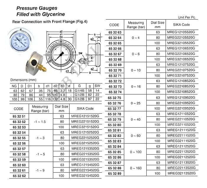 IMPA653289 PRESSURE GAUVE, FILLED WITH GLYCERINE, BOTTOM BACK CONNETION WITH BACK FLANGE, #MERG32113510G, 0 ~ 160 BAR, 100 MM DIA,