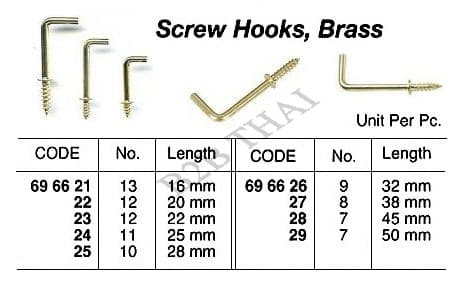 IMPA696621 BRASS SCREW HOOK, NO.13, 16 MM