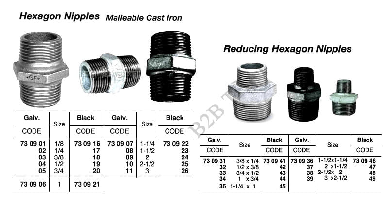 REDUCING HEXAGON NIPPLE, SCREWED, MALLEABLE CAST IRON, BLACK, 1-1/4 x 1