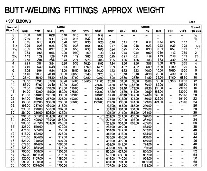 STEEL BUTT WELDING 90 DEG ELBOW WEIGHT TABLE