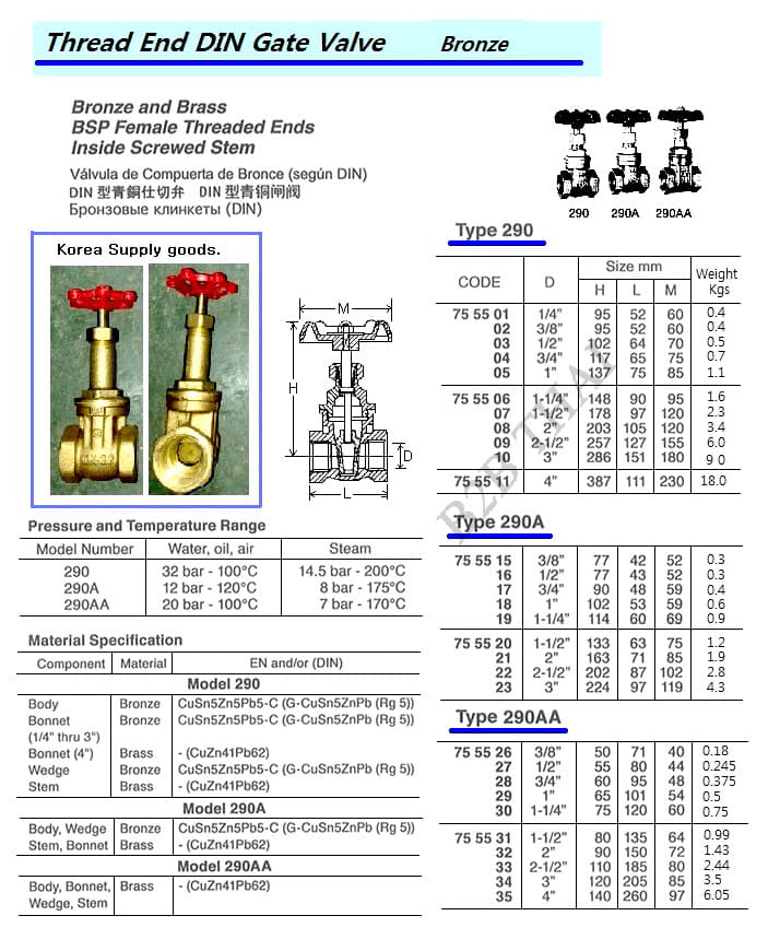 GATE VALVE (DIN), BRONZE, BSP FEMALE THREADED ENDS, STRAIGHT 290A TYPE SIZE D 3/8″