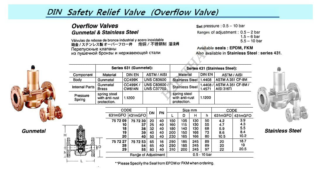OVERFLOW VALVE (DIN), GUNMETAL, BOTH FLANGED END, 631mGFO, DN 40