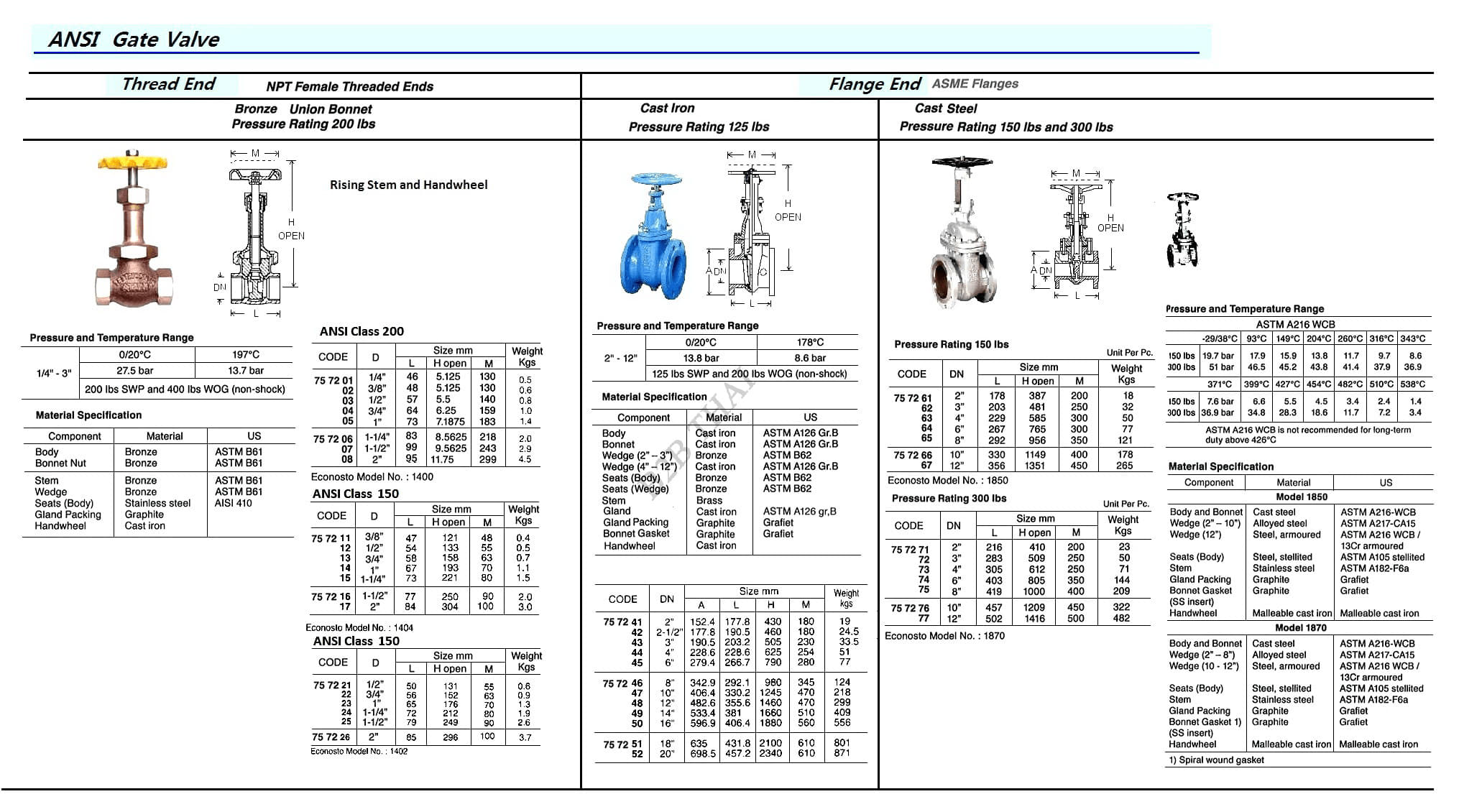 GATE VAVLE (ANSI), CAST STEEL, ASME FLANGE, 150 LBS, DN 12″