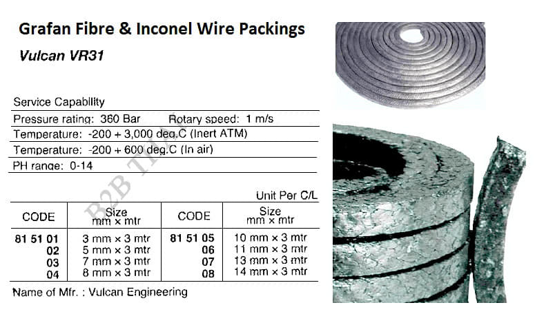 GRAFAN FIBRE & INCONEL WIRE PACKING, VULCAN VR31, 8 MM x 3 MTR