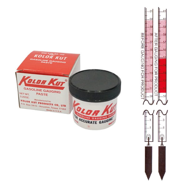 KOLOR KUT GASOLINE GAUGING PASTE is light pink in color and turns red upon contact with gasoline, diesel, naphtha, kerosene, gas oil, crude oil, jet fuels, and other hydrocarbons.